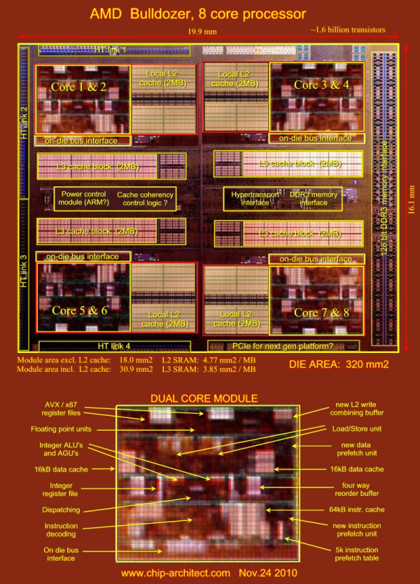 When news started to spread that Global Foundries had released a die shot of bulldozer many were surprised that it hadn’t come from AMD itself. This dies shot, although openly photo shopped by AMD, was used as the basis for many speculative comparisons and die size estimates. The most interesting fact to many during this period was that a Bulldozer module was about the same same as a Sandy Bridge core, or two K10.5 cores.
