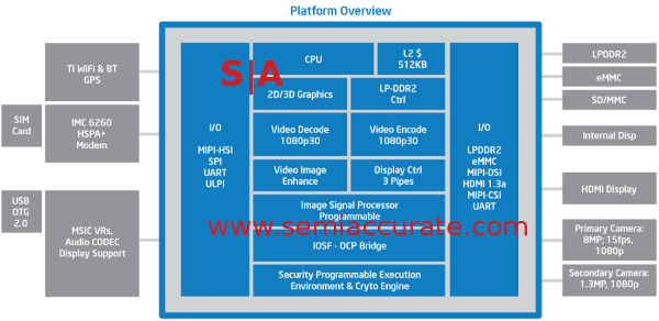 Although it may seem related, the block labelled Image Signal Processor is not, it isn’t even close. This particular block is by Intel, or the company Intel recently bought, Silicon Hive. They made image processors like this one, and are not related to any of the Imagination cores above. All this does is take raw camera data at up to 240MPPS for video, 16MP for stills, and tweak it. Things like image stabilization, color adjustment, and various clean up effects are available, and more can be programmed at will.