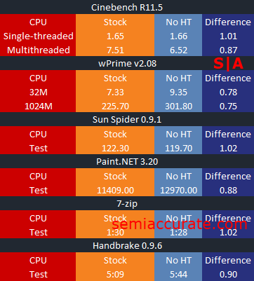We decided to explore the effects of Hyper-Threading on the performance of the Ivy Bridge based Core i7-3770K by running our CPU benchmarking suite on it twice. Once with Hyper-Threading enabled, and once with Hyper-Threading disabled. As such we set-up our results table to look for applications that perform better with Hyper-Threading disabled, rather than enabled.