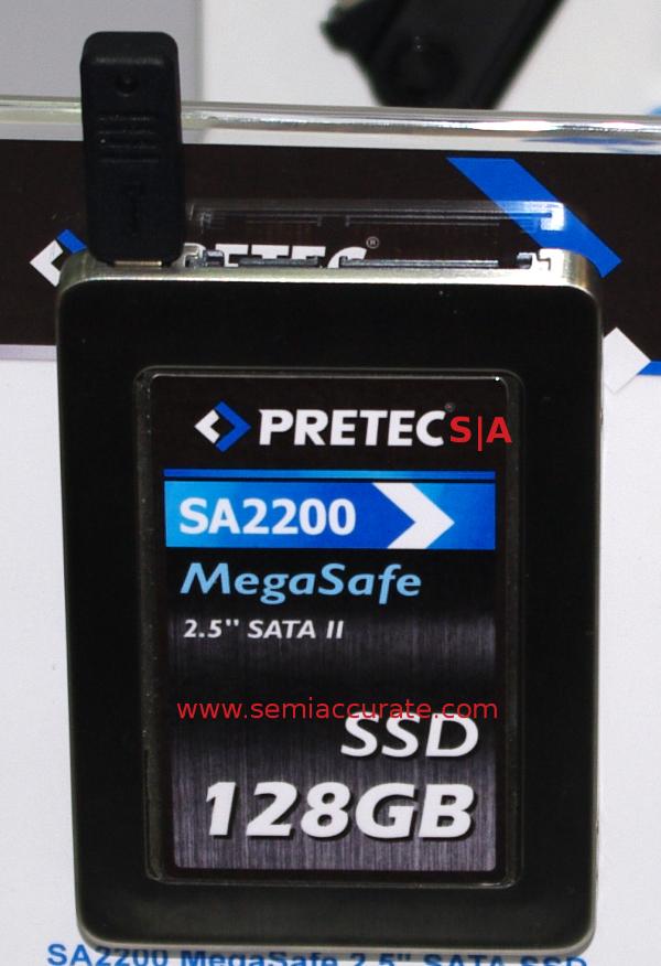 Probably the best thing at the booth was the MegaSafe 2.5″ SATA2 SSD with hardware AES encryption. The MegaSafe comes in sizes up to, wait for it, 128GB, so it is small and by modern standards, slow. If you are wondering why this is worth a second look, much less a ‘best’ label, take a look at the little dongle out of the top