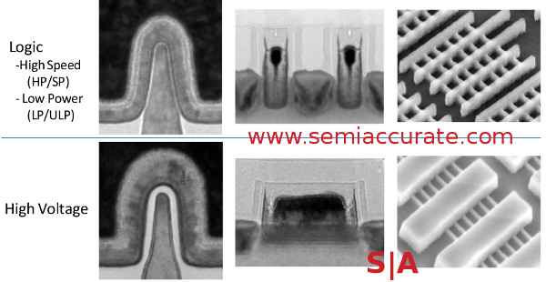 The big concern that SemiAccurate had was that Vt control would be problematic on a FinFET. Ion implant is extremely tough with high aspect ratio structures, and the obvious method of the past, changing contacted gate area by making the fin taller, is a non-starter. Why? If you make transistors at an uneven height, it makes the next few layers a bit tricky, usually fatally so. The other way to increase contacted area, making the gate longer, eats die area, removes the additional benefits of going vertical. While added length works, it has a high cost, and somewhat defeats the purpose of using the third dimension.