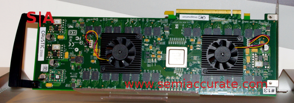 The boards are called the R2100 and R2500, they come with 4GB and 16GB of DDR2 respectively. This says that the R2500 is just two R2100 on a single PCB with double the memory per chip, but they don’t share all of that memory space. Both boards use PCIe2, 8x for the single and 16x for the dual board. You can see the PLX PCIe switch in the center too, its presence pretty much confirms the independence of the two GPUs.