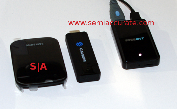 The last device is at the complete opposite end of the market, a consumer oriented DLNA dongle. Miricast devices seem to be a dime a dozen lately, but Cavium was one of the first to have products on the market years ago. If you have been to a lot of trade shows, you probably recognize the form factor of the Samsung DLNA device on the left, this design has been rebadged by a lot of OEMs.