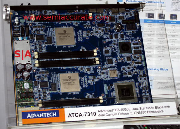 A little bit farther up the performance ladder is this Octeon II board, it has two CN6880 CPUs on it. It is an ATCA 40Gbps line card made by Advantech, and that would be 40Gbps packet processing per socket, 80Gbps for the card. Cavium lowballs the performance though, only publicly claiming 77Gbps thoughput. Not bad for 64-cores running at 1GHz with 64GB of RAM, and really not bad considering it only pulls 200W total. Try that with your PC and watch it choke.
