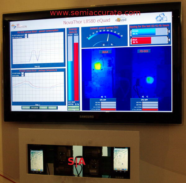 The headline is of course the FD-SOI process that allows the NovaThor SoC to hit 3.0GHz without melting a hole in the steel table it is sitting on. One often overlooked side of this is how much power you can save using the same device at a lower frequency, in this case the same 1.85GHz that the non-SOI 28nm chip runs at. Take a look at the demo below, the two phones at the bottom have their backs removed and an IR camera pointing at them. Those images and some related data is shown on the screen above them.