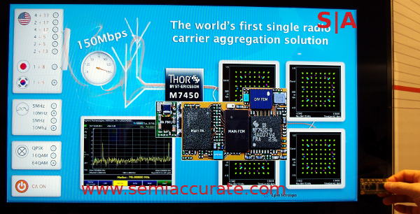 The last demo was again pretty simple to describe, it uses the ST-Ericsson M7450 to do carrier aggregation at 150Mbps on a single chip. For those of you not versed in telecom spectrum allocation minutia, and shame on you if you aren’t in this day and age, what this means is every carrier has a subset of the frequencies allocated to them. In the case of cellular data, each carrier has a different allocation and this can vary a lot by country and even with each one.