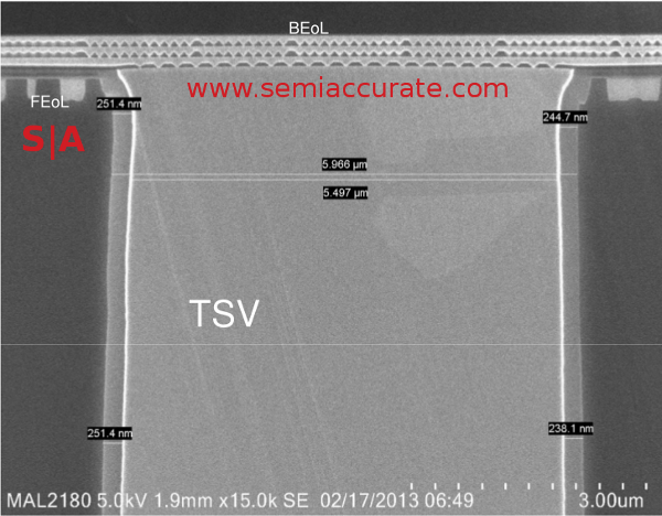 From there, there are technical challenges like yield. Global Foundries has said that their technology works and yields are not a problem. That said, what exactly are they offering? The technical term is a via-middle process because it etches and fills the via after the Front End Of Line (FEOL) portion of the process and before the Back End Of Line (BEOL) portion. For the non-process minutia oriented this more or less means that you lay down the transistors before you etch the TSVs.