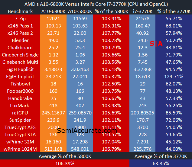 On average the AMD’s A10-6800K is about six an a half percent faster than the A10-5800K that it’s replacing. In single threaded benchmarks like Chalkboard, SunSpider, and Foobar2000 the 6800K only offers a small performance uplift over it’s predecessor. But in multi-threaded workloads and GPU accelerated tests the 6800K is able to demonstrate the advantages of its improved power management scheme by maintaining its turbo boost clock speeds for a longer period of time. When we looked at the A10-5800K last year we noted that on average it offered only 57 percent of the performance that Intel’s i7-3770K can bring to the table. That data point remains more or less true to this day, but AMD’s A10-6800K has closed that gap by a good margin. It’s not enough for AMD to really challenge Intel on CPU performance, but it’s a solid gain considering how little AMD really changed Trinity to create Richland.