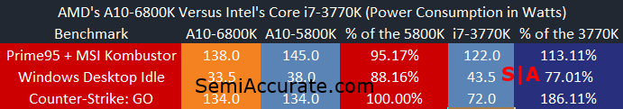 Richland is significantly more power fugal than Trinity. It uses less power at full load and significantly less power at idle. Comparing Richland to Ivy Bridge is less impressive though. It uses almost twice as much power in CS:GO and it uses about ten percent more power than Ivy Bridge under full load. To Richland’s credit though, it does have a 29 percent higher TDP than the i7-3770K. But the cherry on top of Richland is its surprisingly low idle power consumption numbers. AMD’s latest mainstream APU draws a quarter less power than Intel’s Core i7 at idle. Now that’s not to say that the i7-3770K isn’t a frugal chip, but I’m willing to bet that AMD’s power advantage has more to do with how power hungry Intel’s Z77 chipset is, more than anything else.