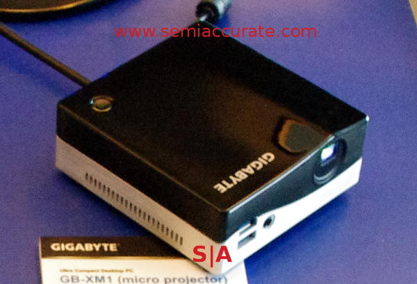 The last Brix is potentially a killer for business users and road warriors, it has a micro-projector built-in. It isn’t amazingly powerful but can put up a decent sized image on a wall or screen at a low but workable WVGA resolution, 800*480 to you and me. Inside it still has an Ivy Bridge but for road warriors a $700 (our unsubstantiated guess at the MSRP, Gigabyte wouldn’t even hint at the real one) Brix plus projector is a killer to have in your bag. Laptops are nice but this is a real PC and projector that almost fits in your pocket.