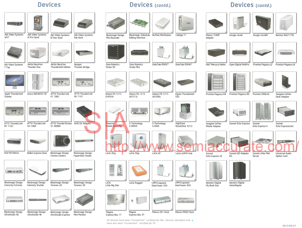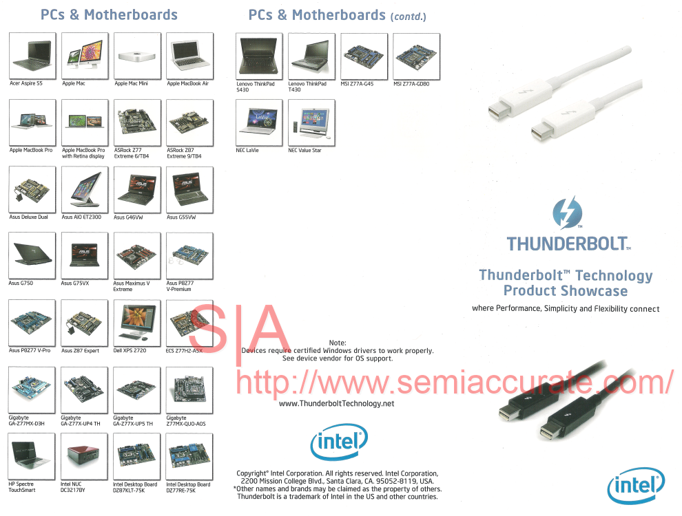 During Computex 2013, we came across a Taiwanese company, showing their latest Thunderbolt devices, next to them were some Intel Thunderbolt leaflets, one particular tri-fold “Thunderbolt Technology Product Showcase” leaflet caught our eyes. Out of curiosity, we counted some of the devices listed on the leaflet.
