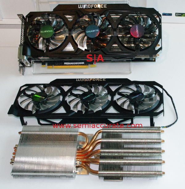 Gigabyte gets around this by shipping you a stock Titan complete with stock heatsink and fan, and also puts their own version in the box. This is a very serious cooler, there are six heatpipes and two fin arrays all capped off by three large fans in a metal, not plastic frame. The new cooler is said to be able to dissipate 450W or so, 150W in Nvidia Fermi-speak, more than enough for even insane overclocking work.