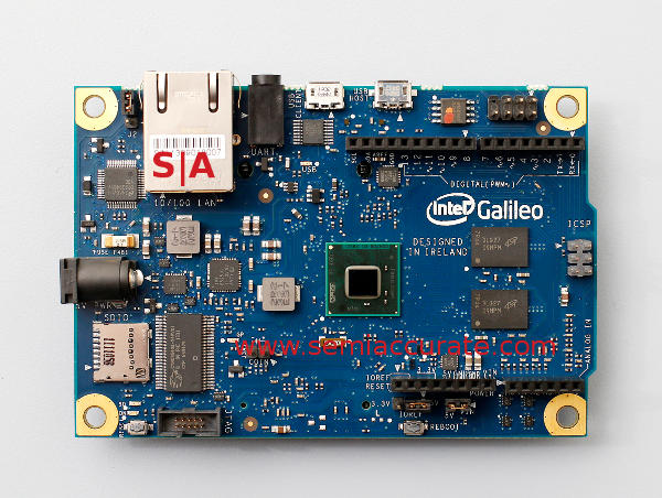 As SemiAccurate exclusively told you last month, Quark is based off a P54C Pentium CPU with all sorts of added bits surrounding it and the chipset pulled on die. Officially it is a “32-bit, single core, single-thread, Pentium® instruction set architecture (ISA)compatible CPU, operating at speeds up to 400MHz” but not officially a Pentium on steroids. The Galileo board is compatible with Arduino Uno R3 shields and supports 3.3 and 5V operation. Better yet the initial data sheet is a promising start.