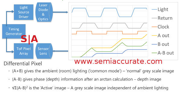 Remember the part about the high modulation rate of the light source? 10s of MHz vs a pixel count of .217Mp? See a disparity? Remember how the dual ported pixels can take an A and a B image for every frame? The sensor can actually do much more than that, it can take multiple A and B exposures per frame. O’Connor said that the sensor can determine exposure on a per-pixel basis, quite the technical feat. This allows the depth camera to have a dynamic dynamic range in a way that most regular cameras can only dream of. More importantly it solves the dynamic range requirements without throwing expensive hardware at the problem.