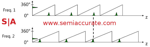 There is one minor problem in that phase wraps after a wavelength, about 3.75m for the 80MHz light frequency the Kinect designers wanted to use. You might have noticed that a 3.75m wrapping distance is less than the 4.2m that the design goals specified. If you use a lower wavelength this effectively extends the distance before phase wrapping but will drop your resolution. This also runs afoul of another design goal and so it is equally a non-starter. So what do you do?
