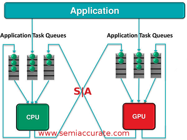 An application will put tasks in a CPU queue by making up a packet and putting it in a predefined memory location. When the CPU is ready it knows where those memory locations are and what formats the contents use. Since each packet is a fixed 64B long, this is easy enough to do with simple pointers. Likewise a GPU also has queues that work in the exact same way, memory locations, pointers, and a bit of magic allows the app to just dump work packets in the GPU queue as well. On an APU at least everything is effectively the same for CPU compute and GPU compute, the application just needs to pick what goes where and when. So far so pretty normal.