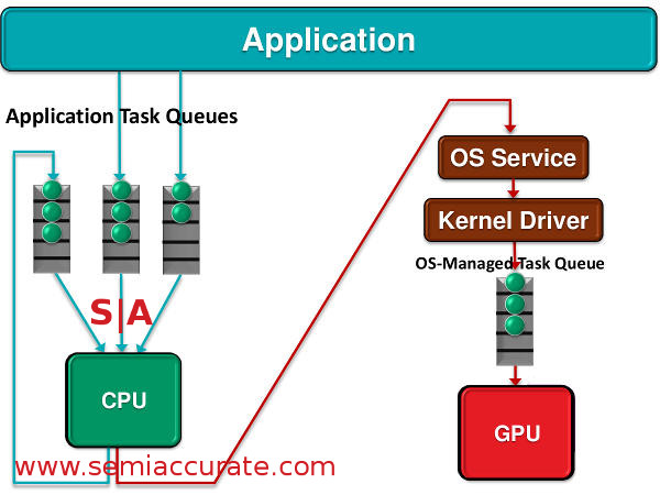 What hQ brings to the table is now this communication becomes bidirectional. More importantly look at what talks to what and the paths to get there in the diagram above. In the old way the application only talks to the CPU and then the CPU has to go through many layers of OS overhead to message the GPU. This overhead is called names like DirectX and drivers, something that Mantle aims to obviate as well. In the new hQ way of doing things not only can the CPU put things in the GPU queue but the GPU can put things in the CPU queue too.