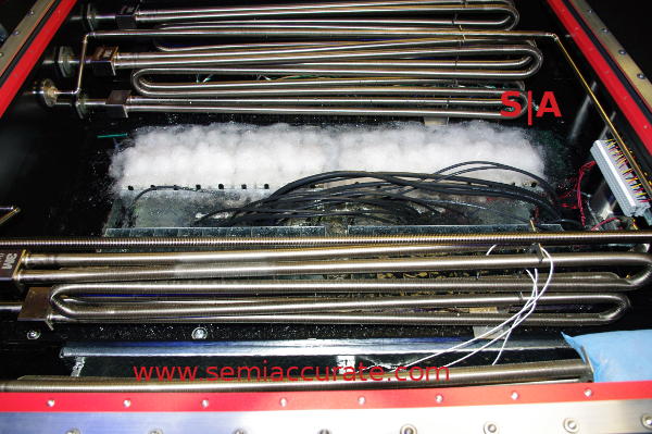 You can see where the vapor line ends up, the ‘wet’ line is clearly visible on the enclosure wall. The cooling loops basically define where the line ends up, if they are working right the vapor should never go above them. The hot vapor is moved off the hot silicon via normally wasted heat energy. The loops cool things down and the Novec just drips back to the pool. All you need is a simple divider with a slit at the bottom and the boiling fluid along with gravity will suck coolant back through to keep the CPUs immersed. No external energy inputs are needed to drive the system, there is nothing mechanical to break, and no large volume of air to bring dust in, it just works on its own.