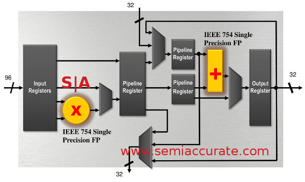 The idea sounds simple enough, put hard FP functions in the DSP blocks of an FPGA, but there are trade-offs. The biggest one is that those transistors take up area, about 1% of the die according to Altera, and that is reflected in ASIC costs. Another way to look at the cost is that FPGAs are all about packing in as many gates as possible, that 1% area could add 1% more usable logic to customers who generally always want more.