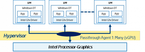 There are currently three versions of Intel GVT: -d, -s, -g. The –d version is a direct pass-through to the GPU where one virtualized GPU output maps to one GPU. The –s version extends this model by allowing multiple virtual outputs from a single Intel GPU. And the –g version extends this even further by allowing multiple virtual outputs to get time slices of the GPU’s full performance. Intel has promised that more version of GVT are coming in the future.