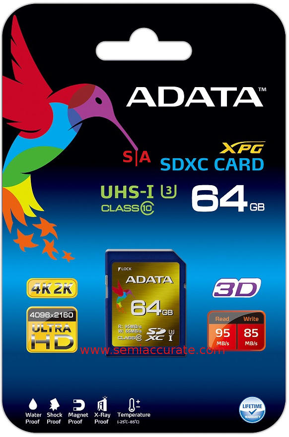Why would you want this kind of speed? 4K video is ostensibly the driver but anyone with a DSLR knows how burst mode can chew up bandwidth in a hurry. It never hurts to have faster storage in a camera or video camera, it is one of the few places where more is still universally better. The list prices for the trio is $64.99, $109.99, and $129.99 respectively, our guess is it is for the 64GB XPG, 64GB Premier Pro, and 128GB Premier Pro respectively. As a user of the previous Adata UHS-1 Speed Class 1 SDXC cards, I can’t wait to try these new ones out.S|A