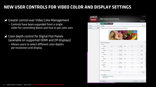 AMD’s also giving users the ability to control the color output of their graphics cards on a per display basis for HDMI and DP displays. This gives multi-display users another tool in their arsenal to combat the visual differences between displays when they are displaying the same image.