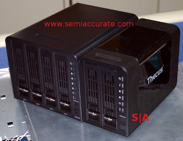 The most important devices are the two and four bay NASes from Thecus, those are the mainstream volume parts. These two are all new and quite different from their predecessors on the outside and inside. On the outside the new 4310 and 2310 are much smaller and more rounded, made possible by a similarly smaller main board on the inside. Take a look at the new face of Thecus.