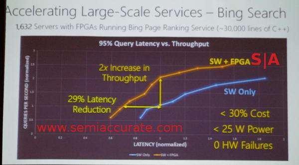 Microsoft gave at talk at ISCA 2014 called, “A Reconfigurable Fabric for Accelerating Large-Scale Datacenter Services”, where they essentially put a PCIe based FPGA in their 2U servers. This lead to a massive gain in performance in Bing, something that over 18 users will appreciate. It also lead to a lot of headlines and a big mindshare leap for FPGAs in the datacenter, who would have guessed that FPGAs could accelerate search?