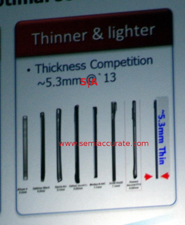 As Z-height drops, basic engineering rules say that stiffness decreases, you don’t make a bridge in 2D for a reason. That means you have to use more rigid materials which almost always equate to denser materials. If you look at the “Ultrabook” PCs and superthin phones, they are almost always heavier than a stiffer, thicker, and cheaper phone. After a certain point, thinner is heavier as well as more expensive and we are well past that point now too.