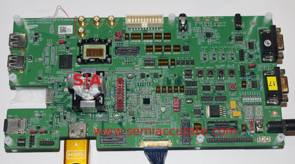 At ARM’s Techcon a few weeks ago Samsung was showing off their 14nm tech in three forms, a wafer, a 14nm SoC board, and a demo system running on said board. Here are two of the three, a 14nm FinFET wafer and the board it is chopped up and placed into. Said board running a ‘phone’ emulator playing a video is just that, it works, yay but not worth a picture. Enjoy.S|A