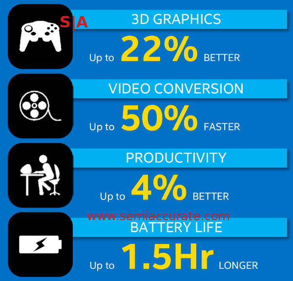 Yup, video conversion is up a whopping 50%, the graphics are 22% better, at best, and productivity, aka CPU performance is “Up to 4% BETTER”. Battery life is a claimed max of 1.5 hours longer but this has precious little to do with the CPU at this point, it is more the rest of the platform. In short Broadwell can’t get out of its own way if you hit it with a stick, just like we told you.