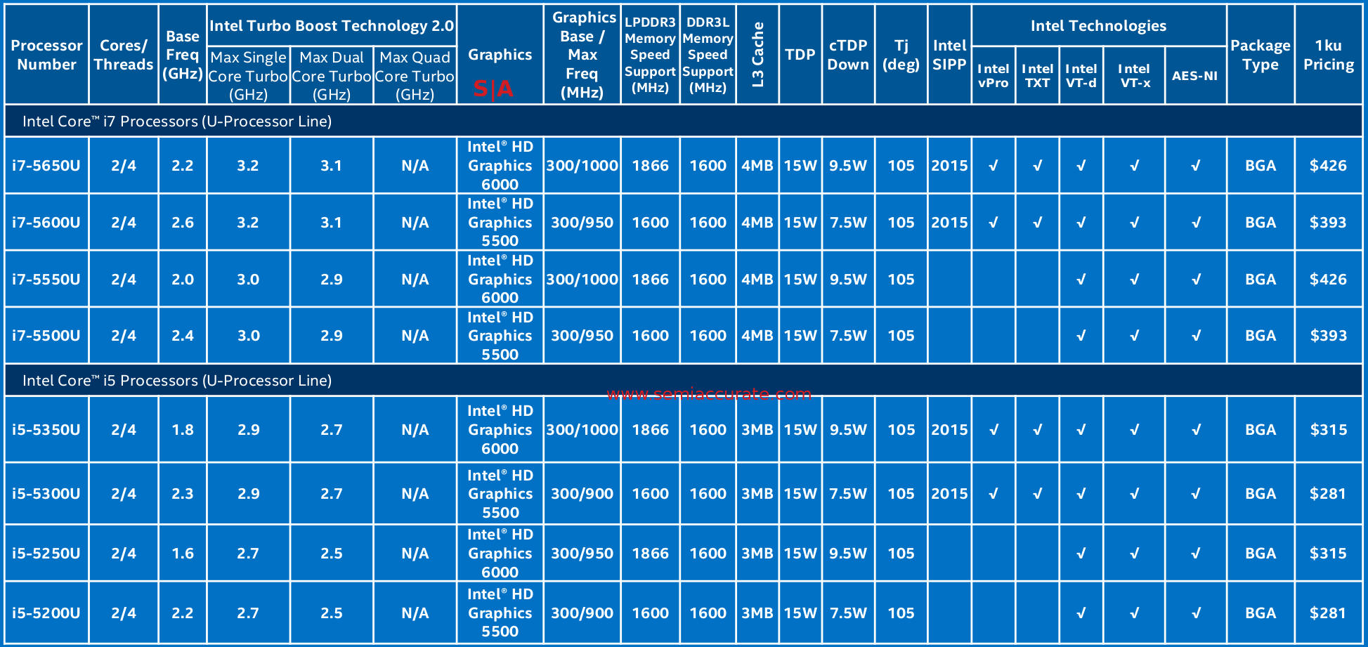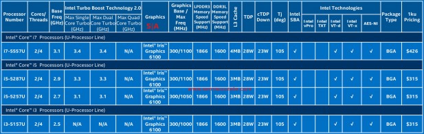 On the 28W parts the graphics are all labelled “Intel Iris Graphics 6100” meaning 2+3 with nothing disabled and Crystalwell-like DRAM caches. Don’t expect games to run though, having tried it recently all I can say is the drivers don’t crash but don’t offer much above “not crashing”. Functional transparency will not come from a shrink, come on Intel… On the 15W parts things get more interesting with three different levels. Those would be “Intel HD Graphics”, “Intel HD Graphics 5500”, and “Intel HD Graphics 6000/6100”.
