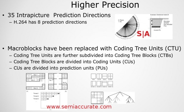 Some of this complexity is pictured above starting with the prediction directions. You might recall H.264 had eight directions to move a block, something that plays well with fixed or multiples of a fixed block sizes. H.265 does away with many of these block restrictions and completely rethinks the prediction directions. There are now 32 different modes and if you look at how they are possibly oriented, you can also get a good idea about how software is meant to parse an image, top left to bottom right. Having 4x the prediction directions means far more than 4x the compute is needed to encode but the resultant output is a far more efficient stream.