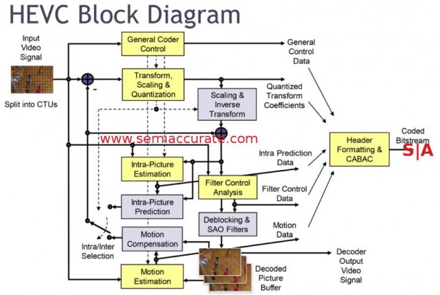 In the end you get something that is horribly complex and time-consuming, even the block diagram of the process is complex. Multicoreware says that HEVC requires about 5-10x the compute power of H.264 which is not light duty in it’s own right. Also keep in mind that the overhead is for the same resolution, if you are talking 4K, multiply that by 4x. 120Hz, stereo, large color gamuts, 10+bit color, or any of the other upcoming features that UHD may bring will only add to the total, so think massive compute costs to encode.