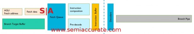 Luckily for ARM there are several other optimizations that feed into the branch predictor and fetch unit that can ease it’s burden. First is that the M7 uses the Thumb2 ISA, not the newer ARM ISAs and so there are a lot of 16-bit instructions. That means the instruction fetch bandwidth is lower than on newer architectures and ISAs making things a bit easier. The fetch pipeline is also two stages plus one pre-decode stage that can be sort of counted here.