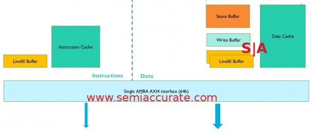 There is also another linefill buffer, a store buffer, and a write buffer on the data side. The store buffer can hold four 64b entries for heuristic draining, basically keeping things in storage as long as possible in the hopes of merging stores. This saves bandwidth and more importantly energy. The buffer can be configured for write through or write back depending on the needs of the implementor. Data linefill buffers, there are two, support dual independent loads.