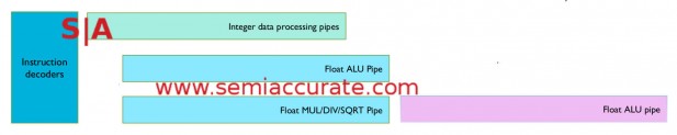 The FP pipelines are all optimized for single precision but can do double precision with far greater efficiencies than software but not quite as good a s fully DP oriented pipeline. Given the workloads the M7 core is aimed at, there isn’t much heavy DP FP needed in the space. One other neat feature is that the FP pipeline can stall at any stage so DP FP and complex ops like subnormals are a lot easier to pull off with the limited resources of an M7 core.