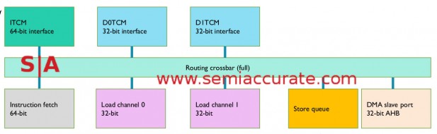 There are five total connections to the TCM crossbar which are not memory. Three of these, the 64-bit wide instruction fetch and the two 32-bit data fetch ports are quite obvious. The other two, a store queue and a DMA slave port aren’t nearly as obvious. The store queue is just what it sounds like, a small buffer optimized for the memory types the TCM will use. This saves power and memory cost but doesn’t do any fancy tricks, it is a just simple queue. The DMA slave port is mainly there for older AHB bus devices that need to access TCM, handy if you have older IP blocks to bring into the M7 world.