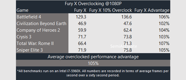 Thus we came out with a maximum GPU clock setting of 10 percent. Given that the Fury X is clocked a 1050 Mhz by default this gives us an overclock of 105 Mhz for a final clock speed of 1155 Mhz. We then began working our now overclocked Fury X through our benchmarking suite when things got weird. Only one game showed a performance increase and all of the other games in our suite actually took performance hits. Our theory is that by raising the power limit to 50 we triggered PowerTune’s thermal throttling which caused the performance hit. So we lowered our power limit settings back to zero percent and retested our ten percent overclock. Then we consistently saw performance gains in all of the titles we tested.