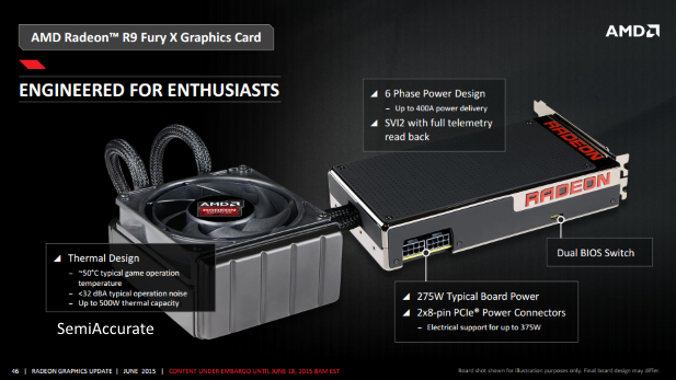 At AMD’s press event at E3 we heard a lot about AMD’s Fury X. One of the points they kept coming back to was the overclocking chops of this graphics card. It’s closed loop water cooler is rated for 500 Watts of heat dissipation, it has two PCI-E eight pin connectors for electrical power supply of up to 375 Watts, and its six phase power design can supply up to 400 Amps. It also has a dual BIOS switch to boot. All of these features give the impression that the Fury X should be a pretty good overclocker.