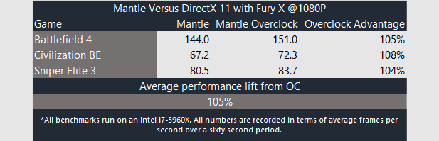 We also looked at overclocked performance in Mantle games.