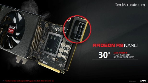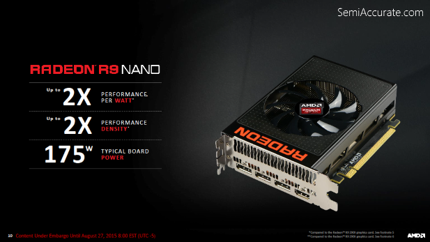 Compared directly to the R9 Fury X this means that the R9 Fury Nano is about ten percent slower but it also cuts power consumption down by an astonishing 100 Watts. With drastically reduced power consumption on the part of this bin of the Fiji GPU a variety of knock on effects occur.