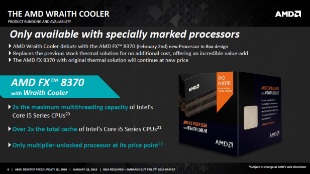 Well AMD is bringing those ideas namely large, nearly silent, constant RPM fans to their other coolers that they package with their 65 and 95 Watt TDP SKUs. To be clear Wraith will only ship with AMD 125 Watt TDP chips and AMD will continue selling the old non-Wraith SKU at a $10 discount compared to the current price and the new Wraith version which will be slotting in at the same price point as the current version of the 8370. AMD plans to roll out Wraith inspired desktop cooling solutions to across all of its desktop product lines by the end of 2016. (Yes, the red plastic fans are real and part of the final design.)