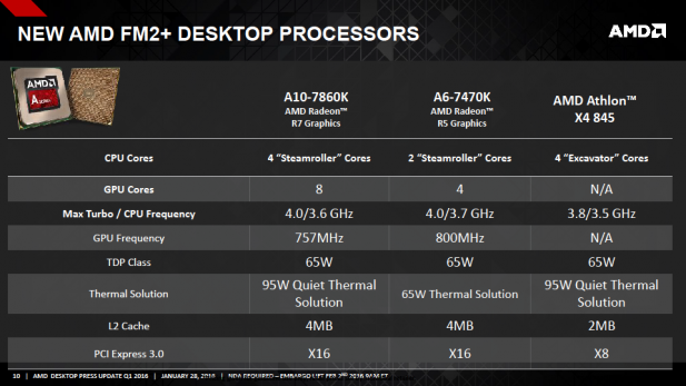 AMD will also be launching four new SKUs in Q1. The A10-7860K which will replace three old SKUs the A10-7850K, the A10-7700K, and the A10-7800. It will also slot in a $120 while offering the same CPU clocks, better GPUs clocks, and a lower 65 Watt TDP compared to all three of these old SKUs. The A6-7470K which is a small speed bump over the older A6-7400K and the Athlon X4 845 which looks like an extremely interesting product because it uses a harvested GPU-less version of the Carrizo die. The Athlon X4 845 has a 65 Watt TDP although AMD claims it was only draw about 50 Watts and will ship with a 95 Watt rated cooling solution to enable overclocking.