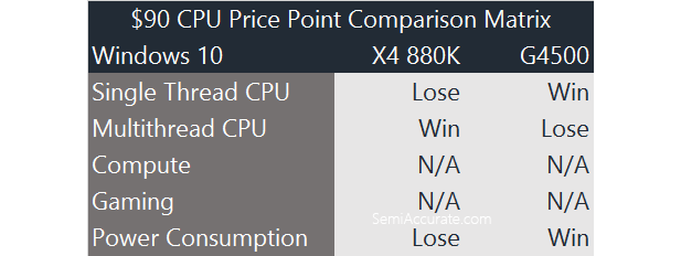 The Athlon X4 880K is the best chip that AMD offers for gamers that are building a socket FM2+ PC with discrete graphics. You get almost the best CPU performance that AMD’s Godavari can offer for almost half the price of the APU version. Within AMD’s product stack this is a chip that makes perfect sense. Where things get complicated is when you consider the competition. Let’s look again at our simple comparison matrix.