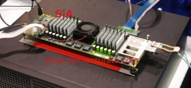 You might remember Achronix because of their tie-up with Intel over 22nm foundry deals several years ago. The result of that marriage was the Speedster 22i family of FPGAs which were on display at Techcon. We won’t go down the full spec list but the FPGA was one of the first to have hard IP blocks embedded, specifically 6 DDR3 controllers, 4x 100Gbps Ethernet, 2x PCIe3 8x lanes, and much more. This is an I/O heavy part which allow you to do things like this.