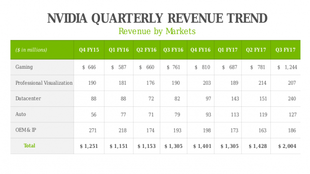 Last Thursday Nvidia dropped it’s Q3 2016 (FY2017) results and crushed financial records all over the map. Revenue for the quarter was a cool $2 billion up 54 percent from a year ago when Maxwell was still the company’s primary product. To say that Pascal has given Nvidia a new lease on life seems like a bit of an understatement. Looking at quarterly revenue over the past two years Nvidia’s booked between $1.1 and $1.4 billion while it shipped its Kepler and Maxwell-based GPUs. Now that the company has nearly completed the rollout and ramp up of its Pascal architecture Nvidia has finally managed to escape the relatively slow rate of growth it’s struggled with over the past few years.