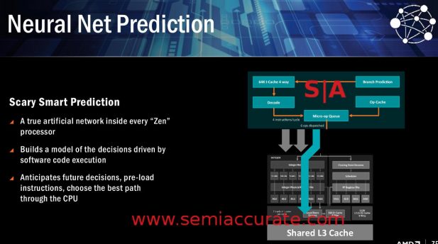 The prediction side things is a little more vague. AMD calls it Scary Smart Prediction with an AI controlled decision-making process for execution. There isn’t much to say about this feature other than it sounds interesting but doesn’t map to any of the details SemiAccurate has heard about the Zen core. When AMD connects the dots fully, we will bring it to you. Since most predictors are well into the 99%+ range already, we are talking small differences but with tens to hundreds of cycles penalty for a miss, fractions of a percent matter. Time will again tell.