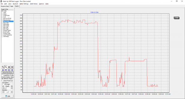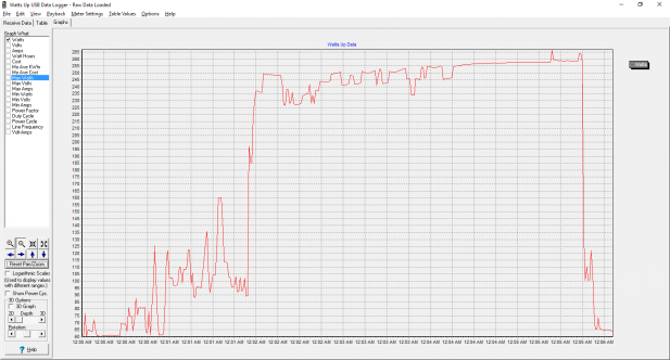Desktop idle power consumption in Windows 10 is a straightforward matter. For a shooter, we want to pick something recent and popular but hopefully a bit forward-looking: DOOM (2016) comes to mind. Picking a strategy game is more complicated: I can think of two games that offer good benchmarks for looking at CPU performance: Civ VI and AotS. But which one to pick? In our testing, the Civ VI benchmark draws a maximum of 265 Watts (graph below) while the AotS benchmark draws a whopping 295 Watts (graph above) from the same system. Our goal here is to get as close to a worst-case scenario as possible inside of a real game.