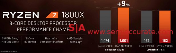 Cinebench may be seen as a non-representative benchmark for some but SemiAccurate is confident that Ryzen’s performance will hold up across a wide range of benchmarks. This last bit may explain why Intel PR sent out a last-minute “call us before you write” email to most of the press, but not SemiAccurate, after hours last night. You could infer that they are suddenly really worried about something. In case we read that wrong, they should be.